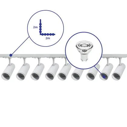 Complete Set 1-Phase Rail L 2 x 2 Meter White | incl. 9x Spot + GU10 2700K 3W Dimmable + End Cap, Power Connector and L -Connector