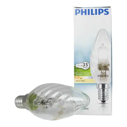 Philips EcoClassic Twisted Candle B35 are twisted flame-shaped halogen lamps. These lamps will replace your old incandescent lamps of comparable form. The lamps have a E14 base, and a BW35 shape.