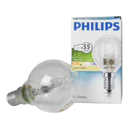 Philips EcoClassic Lustre Clear P45 are halogen lamps suitable for mains voltage. These lamps provide excellent energy efficiency while being dimmable and instantly start up. All lamps in this range have a E14 base and a P45 shape to provide a perfect fit in the fixture.